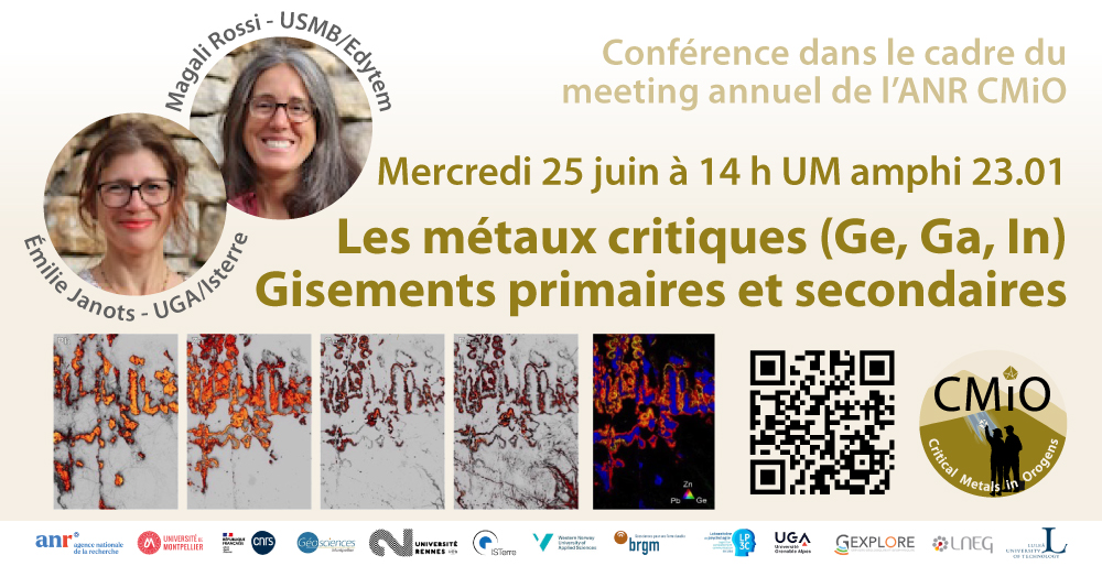 Les métaux critiques (Ge, Ga, In) sont de plus en plus utilisés dans notre quotidien, que ce soit pour la transition énergétique ou la transition numérique. Le germanium est notamment utilisé dans les fibres optiques (et semi-conducteurs), le gallium pour les panneaux photovoltaïques, et l’indium (écrans à cristaux liquides). Ces métaux étant considérés comme critiques, le Critical Raw Material Act a fixé pour objectif d’atteindre 10% de production de la demande européenne sur son territoire d’ici 2030. Dans ce contexte, il est nécessaire d’identifier des ressources pour ces métaux dont la géochimie demeure mal connue du fait de leur très faible concentration (de l’ordre du ppm). Dans les minerais primaires, ces métaux sont très souvent associés à la sphalérite, que ce soit en éléments traces dans la sphalérite ou comme minéraux métamorphiques. Le projet ANR Critical Metals in Orogens entend mieux contraindre les processus primaires de concentration de ces métaux critiques dans la croûte continentale, et leur redistribution en lien avec la déformation et le métamorphisme. Il se focalise sur différents territoires ayant enregistré différentes conditions métamorphiques : la ceinture pyriteuse ibérique (Portugal, faciès schiste vert), les Calédonides (Norvège, faciès amphibolite). Dans une logique de circularité et de soutenabilité, une alternative aux gisements primaire consisterait à réexploiter les déchets miniers dans lesquels les métaux critiques ont été reconcentrés par des processus technosphériques. Le potentiel d’une telle réexploitation sera présentée à partir de l’exemple des Malines (Cévennes).